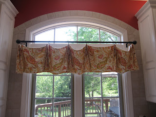 We redesigned this over the sink window treatment. The homeowner wanted to open up her view over the sink so we raised the existing treatment with medallions to accentuate the arch of the window. We also added some beaded trim so it would catch the light in the windows and add more interest.